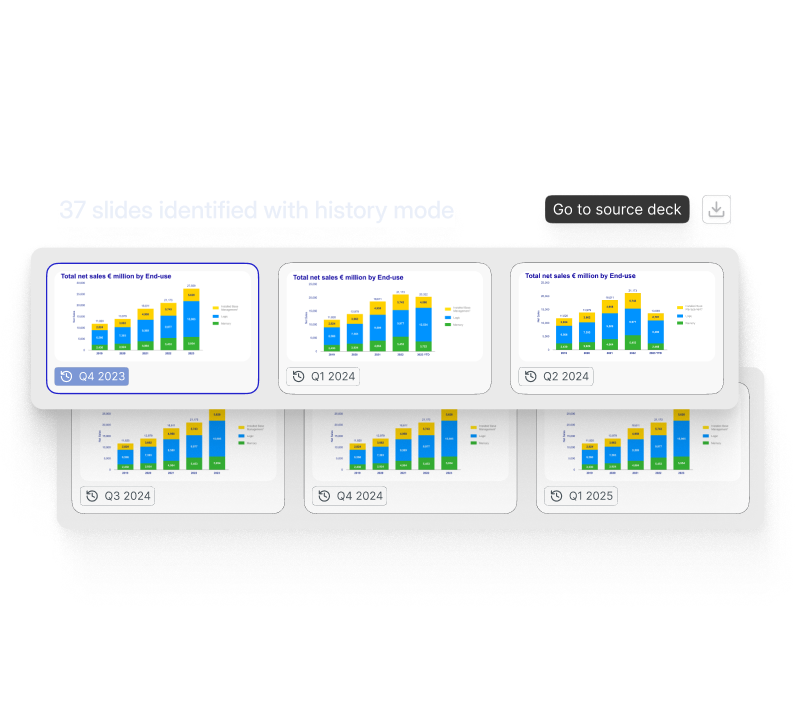 Identify changes in messaging, KPIs, and strategic focus over time. See how individual slides evolve quarter by quarter, year by year.KPIs reveal intent